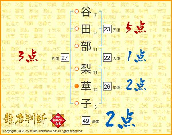 谷(7画)田(5画)部(11画) 梨(11画)華(12画)子(3画)