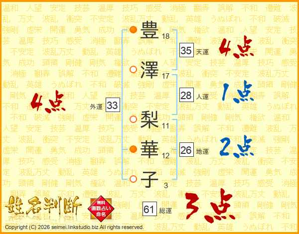 豊(18画)澤(17画) 梨(11画)華(12画)子(3画)