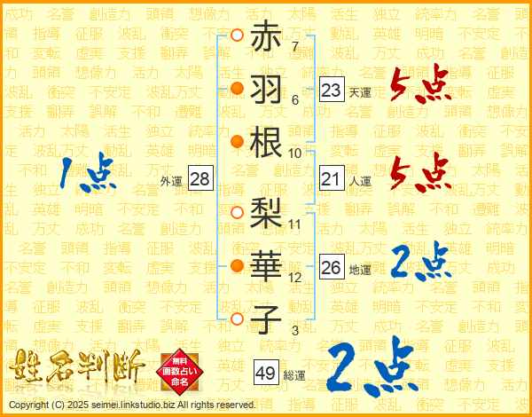 赤(7画)羽(6画)根(10画) 梨(11画)華(12画)子(3画)