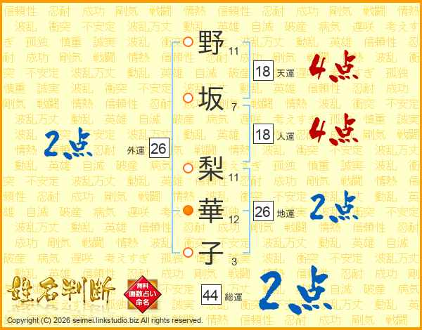 野(11画)坂(7画) 梨(11画)華(12画)子(3画)