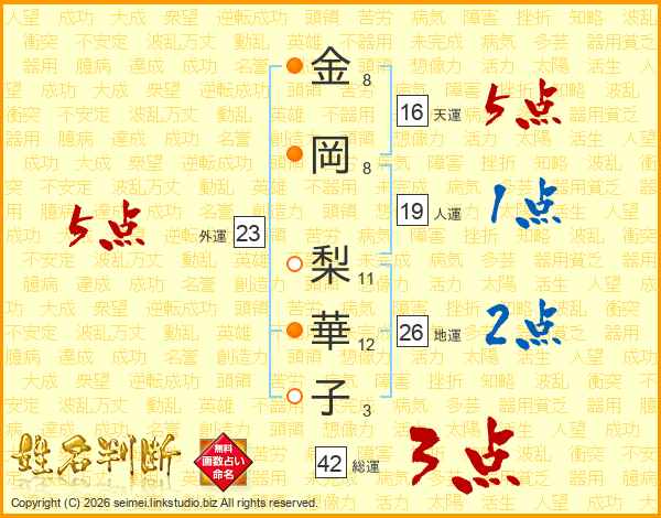 金(8画)岡(8画) 梨(11画)華(12画)子(3画)