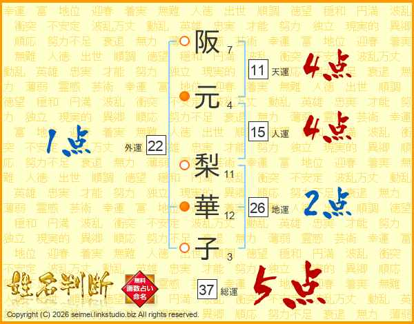 阪(7画)元(4画) 梨(11画)華(12画)子(3画)
