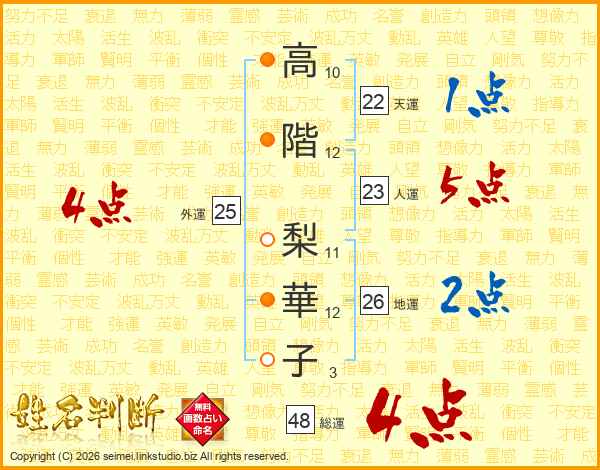 高(10画)階(12画) 梨(11画)華(12画)子(3画)