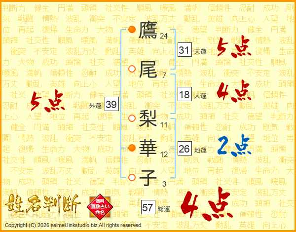 鷹(24画)尾(7画) 梨(11画)華(12画)子(3画)