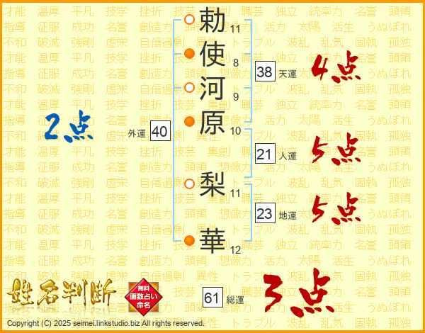 勅(11画)使(8画)河(9画)原(10画) 梨(11画)華(12画)