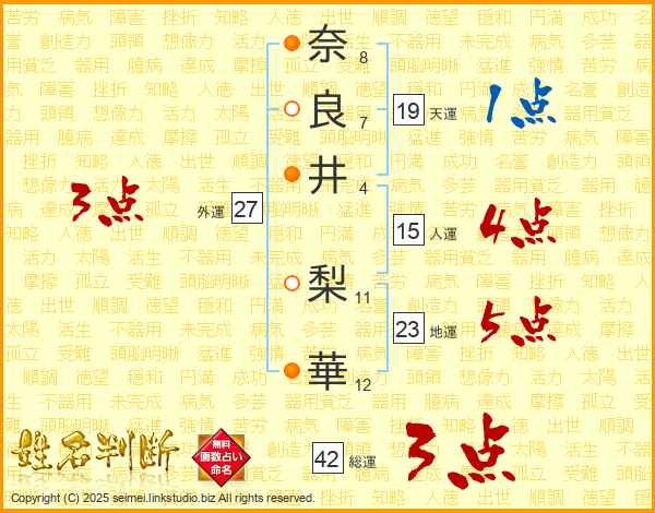 奈(8画)良(7画)井(4画) 梨(11画)華(12画)