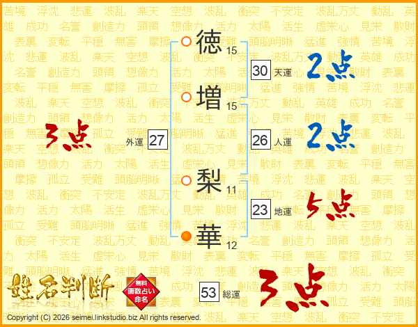 徳(15画)増(15画) 梨(11画)華(12画)