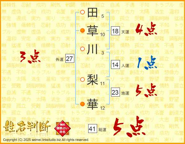 田(5画)草(10画)川(3画) 梨(11画)華(12画)