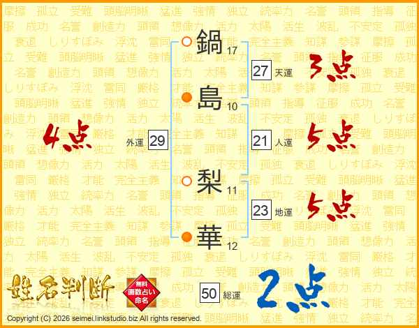 鍋(17画)島(10画) 梨(11画)華(12画)