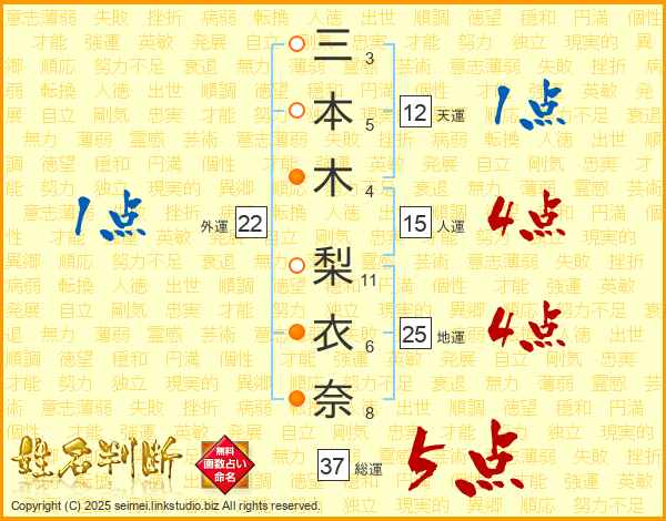 三(3画)本(5画)木(4画) 梨(11画)衣(6画)奈(8画)