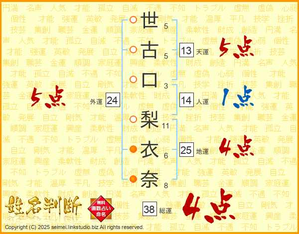 世(5画)古(5画)口(3画) 梨(11画)衣(6画)奈(8画)