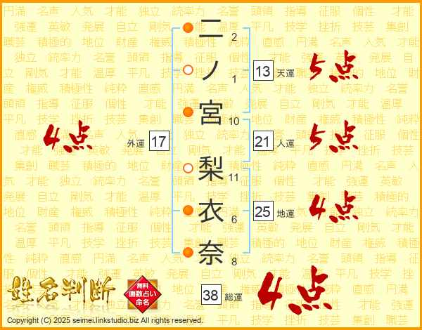 二ノ宮梨衣奈さんの総運は38画の4点!