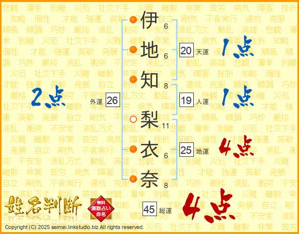 伊(6画)地(6画)知(8画) 梨(11画)衣(6画)奈(8画)