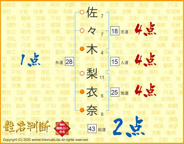 佐(7画)々(7画)木(4画) 梨(11画)衣(6画)奈(8画)