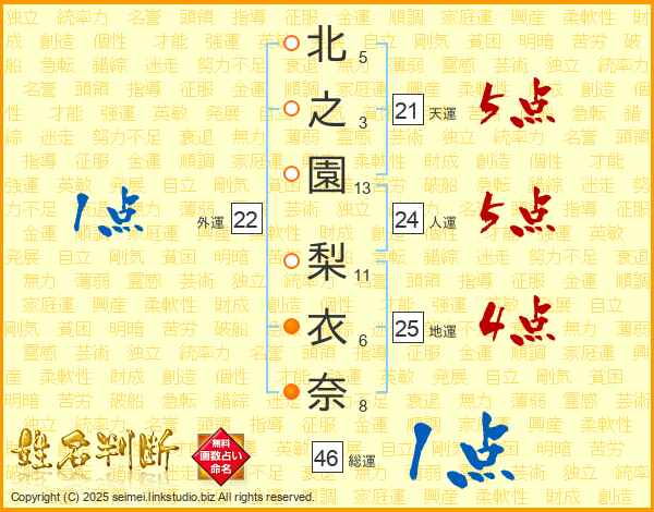 北(5画)之(3画)園(13画) 梨(11画)衣(6画)奈(8画)