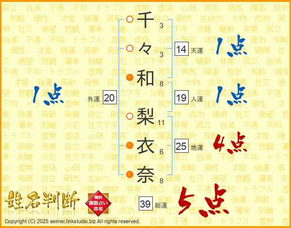 千(3画)々(3画)和(8画) 梨(11画)衣(6画)奈(8画)