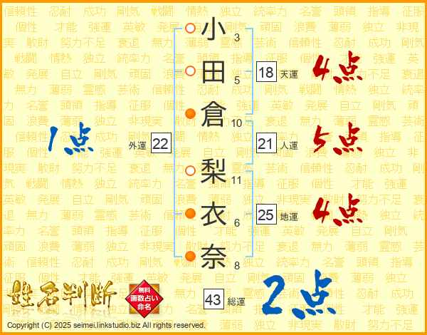 小(3画)田(5画)倉(10画) 梨(11画)衣(6画)奈(8画)