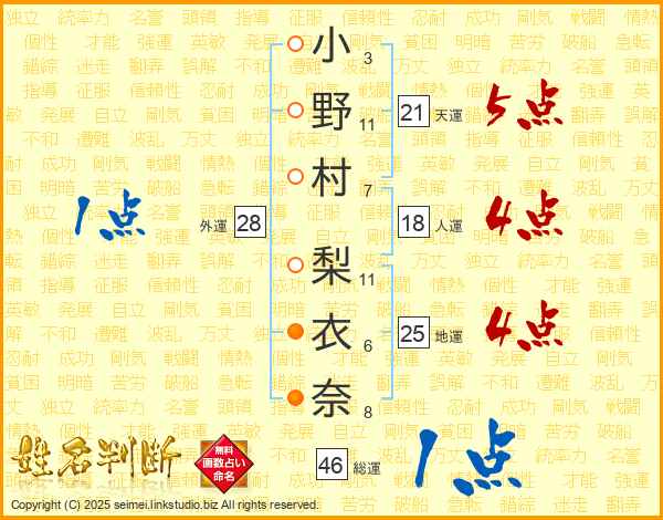 小(3画)野(11画)村(7画) 梨(11画)衣(6画)奈(8画)