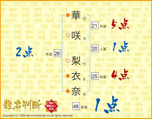 華(12画)咲(9画) 梨(11画)衣(6画)奈(8画)