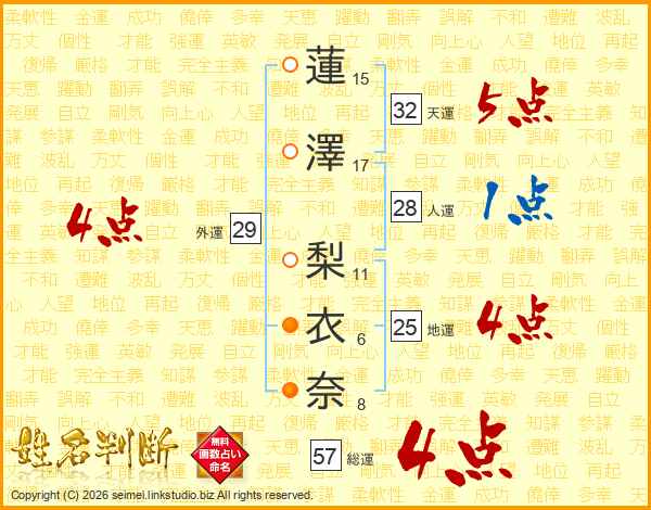 蓮(15画)澤(17画) 梨(11画)衣(6画)奈(8画)