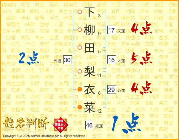 下(3画)柳(9画)田(5画) 梨(11画)衣(6画)菜(12画)