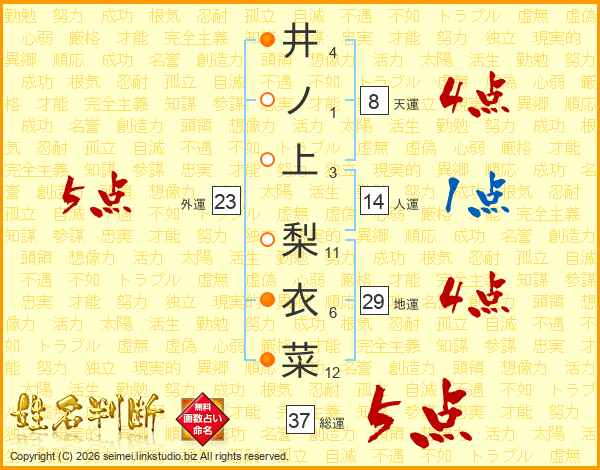 井(4画)ノ(1画)上(3画) 梨(11画)衣(6画)菜(12画)