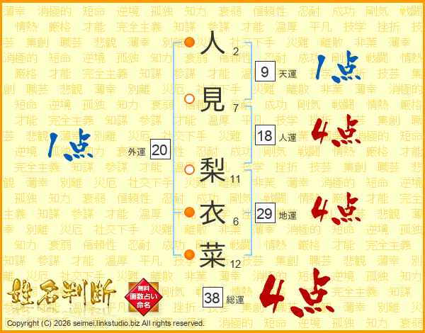 人(2画)見(7画) 梨(11画)衣(6画)菜(12画)
