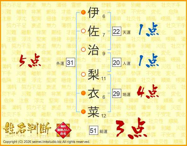 伊(6画)佐(7画)治(9画) 梨(11画)衣(6画)菜(12画)