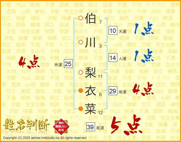 伯(7画)川(3画) 梨(11画)衣(6画)菜(12画)