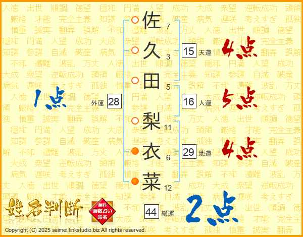 佐(7画)久(3画)田(5画) 梨(11画)衣(6画)菜(12画)