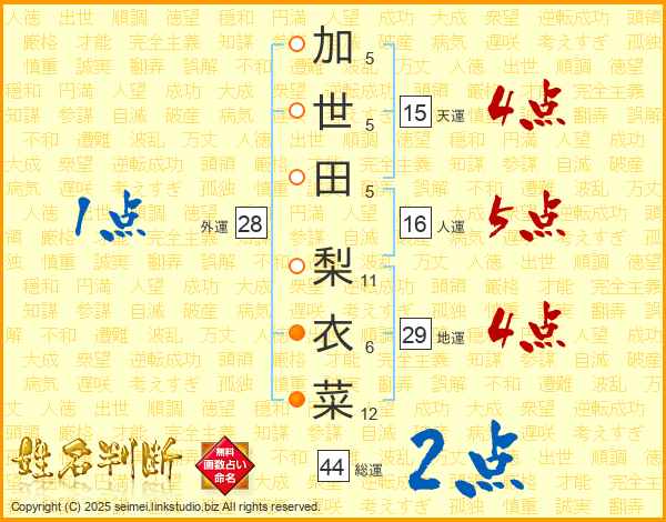 加(5画)世(5画)田(5画) 梨(11画)衣(6画)菜(12画)