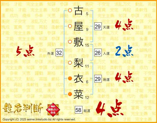 古(5画)屋(9画)敷(15画) 梨(11画)衣(6画)菜(12画)