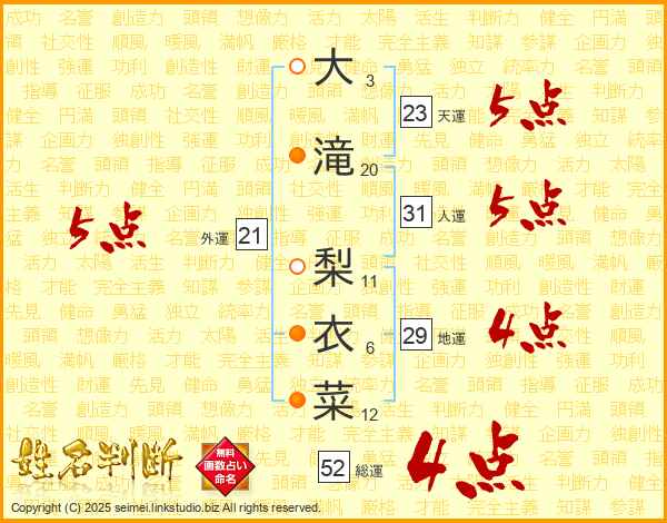 大(3画)滝(20画) 梨(11画)衣(6画)菜(12画)
