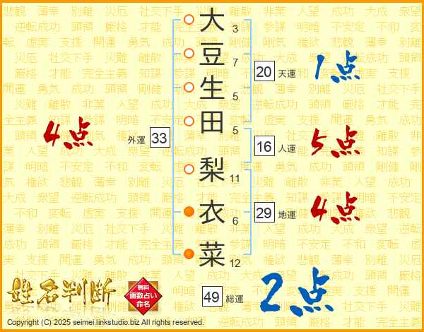 大(3画)豆(7画)生(5画)田(5画) 梨(11画)衣(6画)菜(12画)