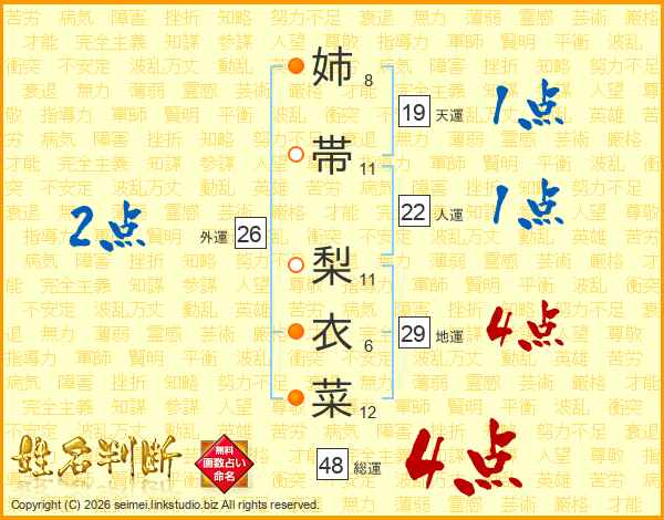 姉(8画)帯(11画) 梨(11画)衣(6画)菜(12画)