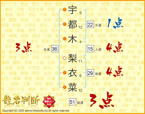 宇(6画)都(12画)木(4画) 梨(11画)衣(6画)菜(12画)