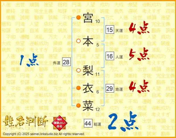宮(10画)本(5画) 梨(11画)衣(6画)菜(12画)