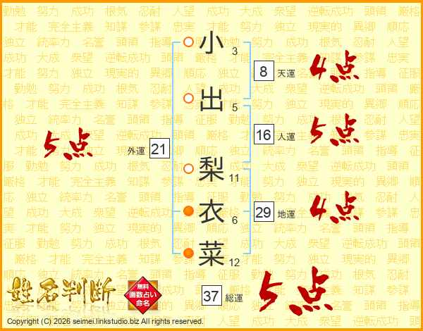小出梨衣菜さんの総運は37画の5点!