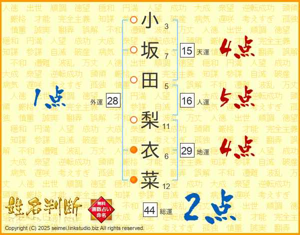小(3画)坂(7画)田(5画) 梨(11画)衣(6画)菜(12画)