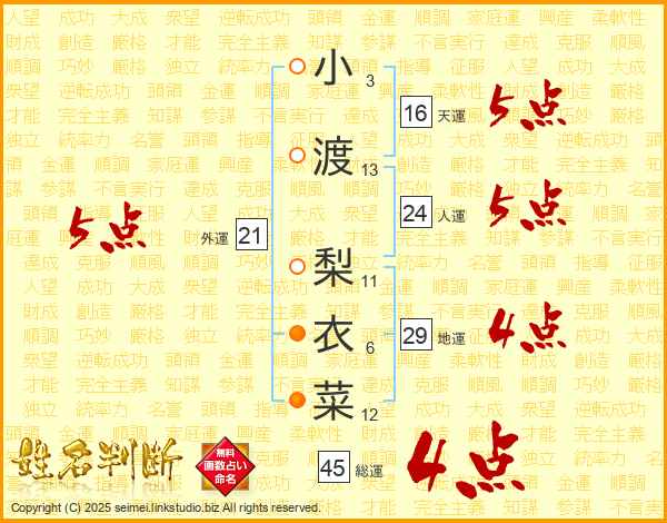 小(3画)渡(13画) 梨(11画)衣(6画)菜(12画)