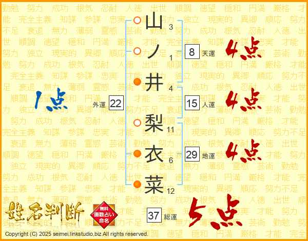 山(3画)ノ(1画)井(4画) 梨(11画)衣(6画)菜(12画)