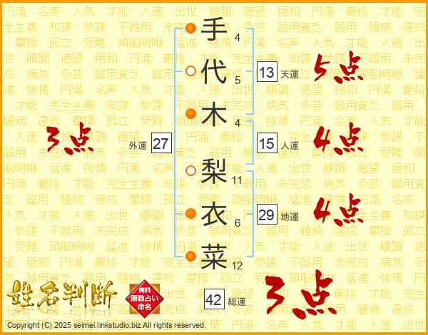 手(4画)代(5画)木(4画) 梨(11画)衣(6画)菜(12画)