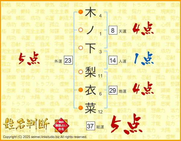木ノ下梨衣菜さんの総運は37画の5点!