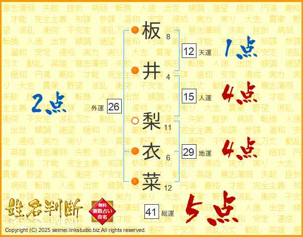板(8画)井(4画) 梨(11画)衣(6画)菜(12画)