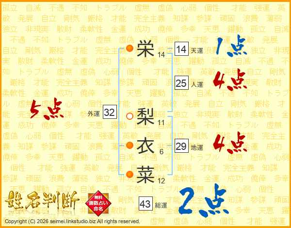 栄(14画) 梨(11画)衣(6画)菜(12画)