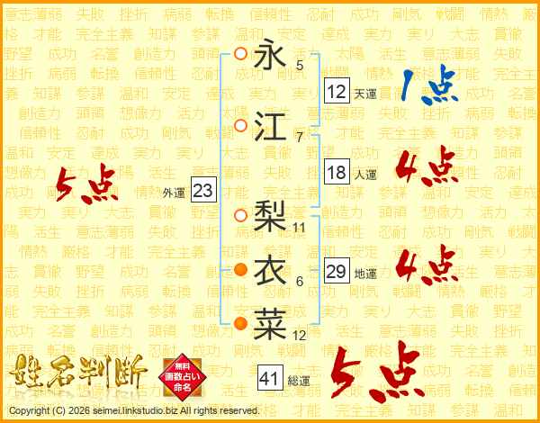 永(5画)江(7画) 梨(11画)衣(6画)菜(12画)