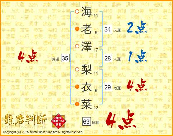 海(11画)老(6画)澤(17画) 梨(11画)衣(6画)菜(12画)