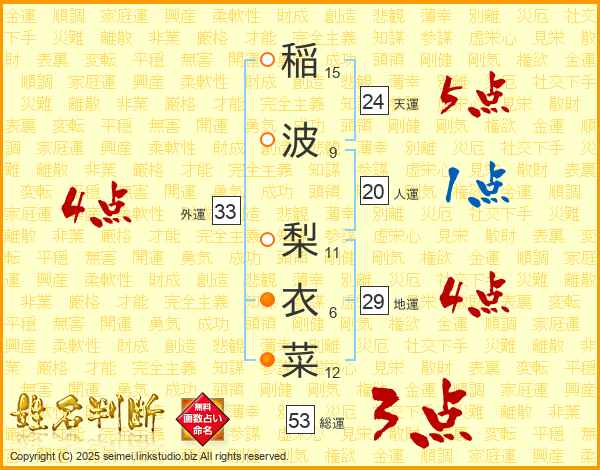 稲波梨衣菜さんの外運は33画の4点!