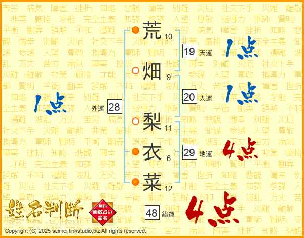 荒(10画)畑(9画) 梨(11画)衣(6画)菜(12画)