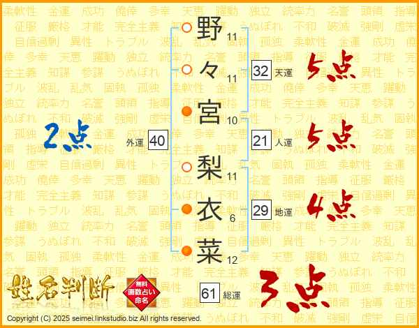 野(11画)々(11画)宮(10画) 梨(11画)衣(6画)菜(12画)